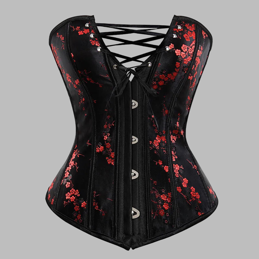 Gooti steampunk-korsett musta värvi punaste lillede ja paeltega