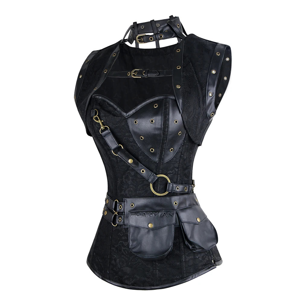 Gooti steampunk-korsett lillemustriga ja nahkrihmadega