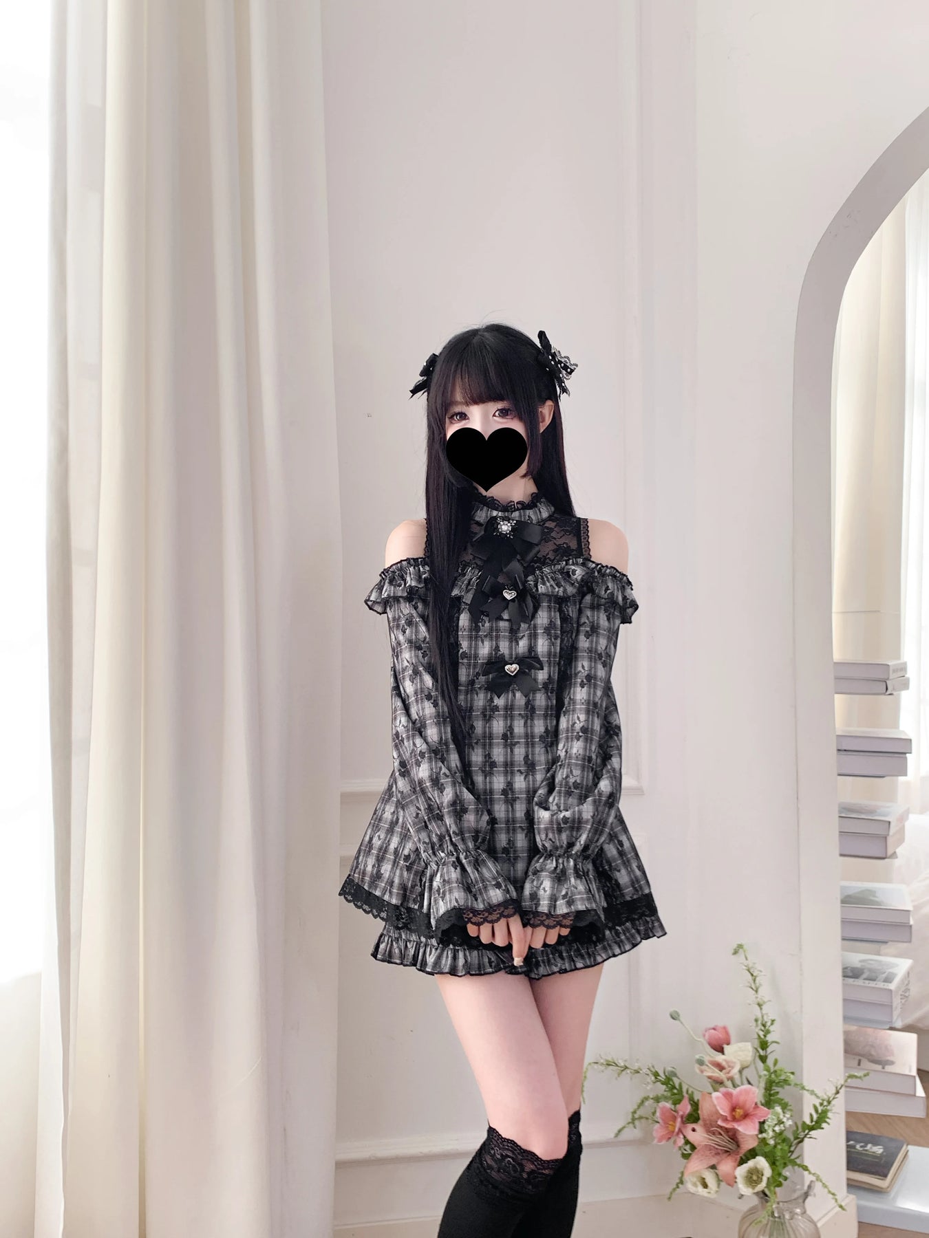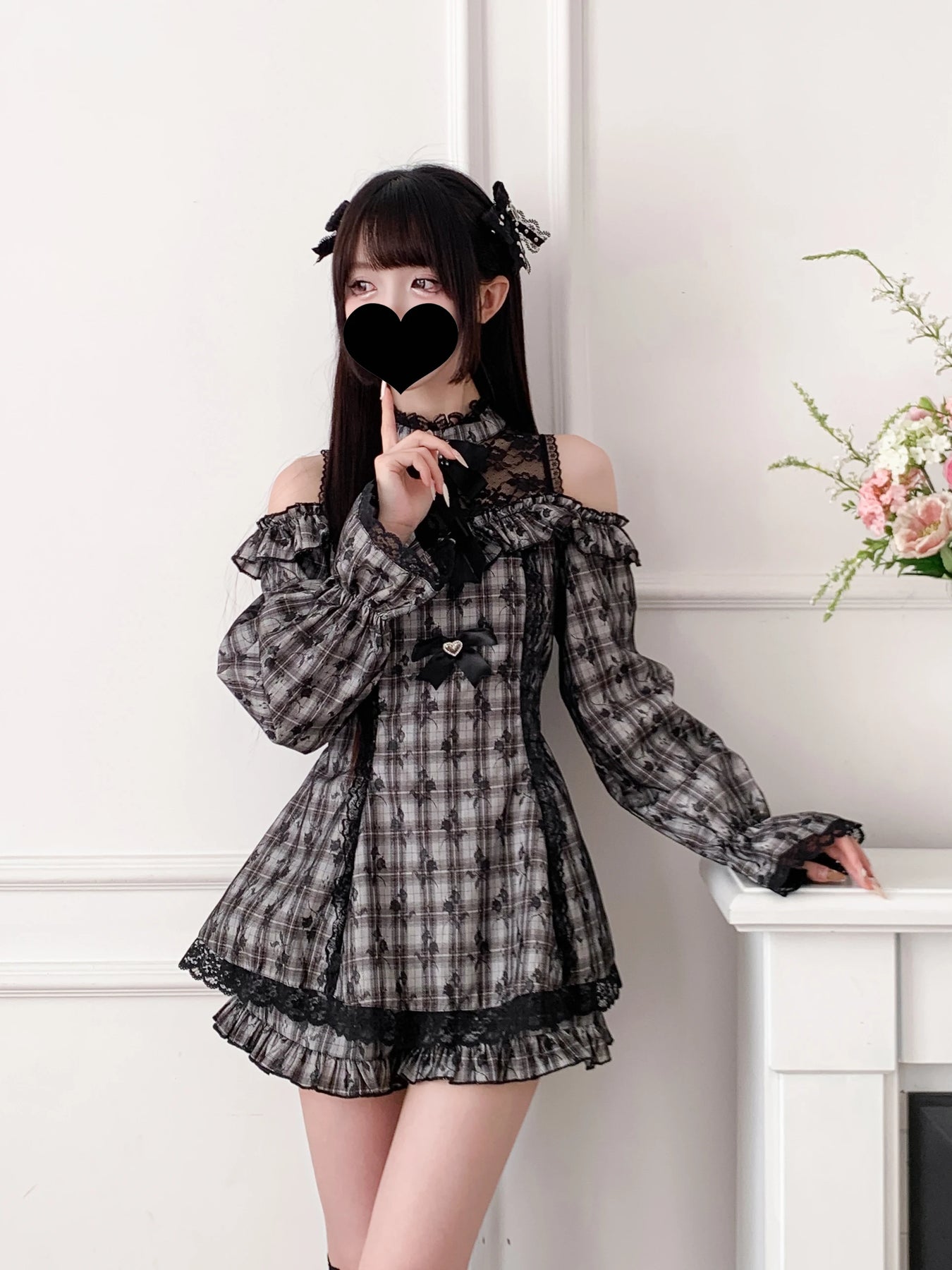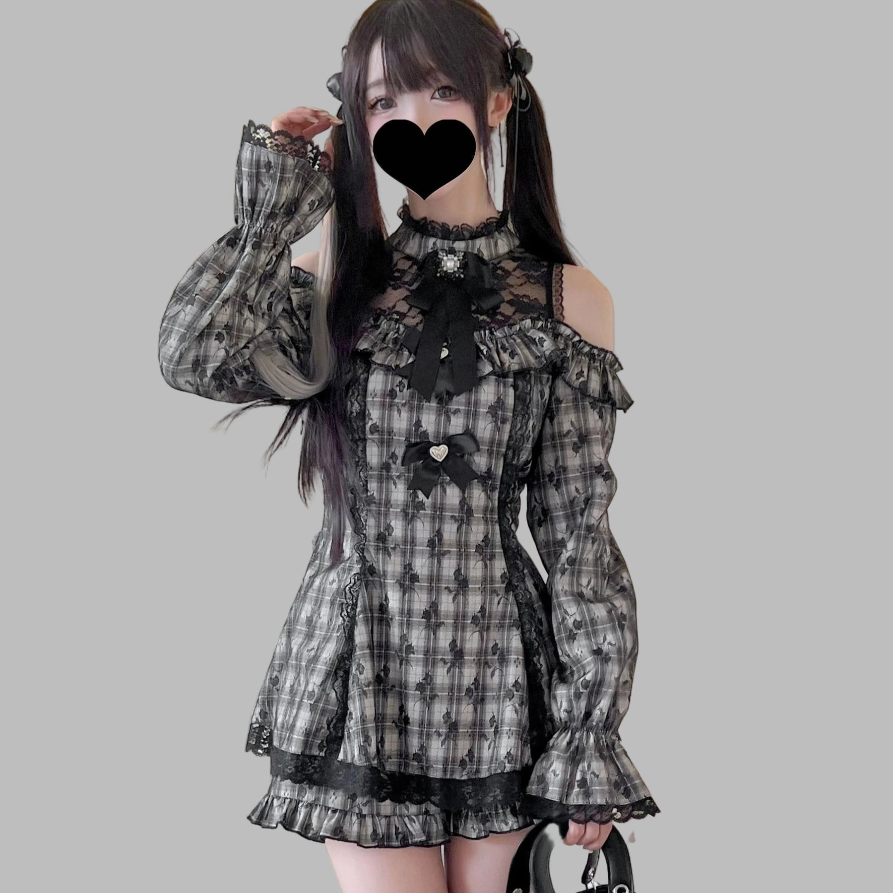 Jirai Kei hall ruuduline pitskleit paljastatud õlgadega