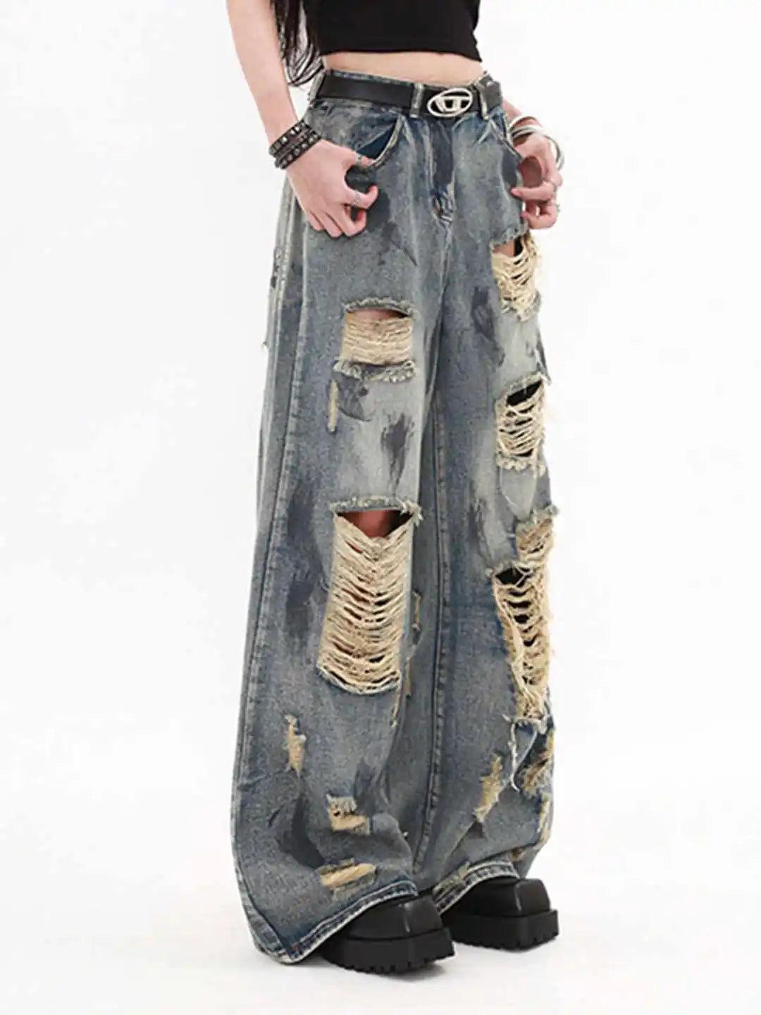 Laiad naiste teksapüksid rebendite ja grunge‑stiiliga