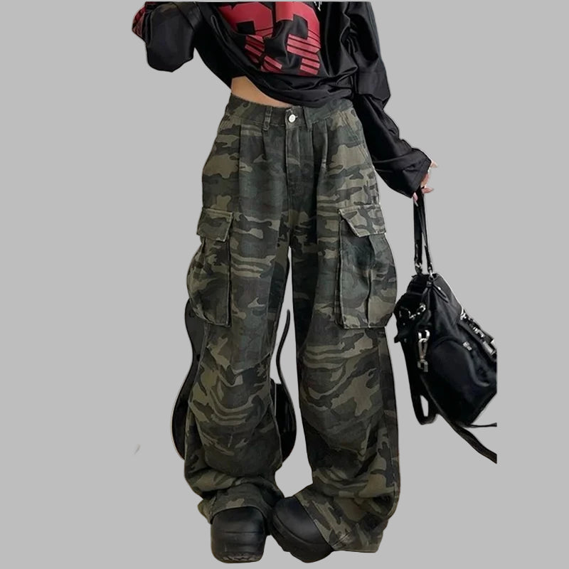 Meeste laiad punk-grunge stiilis militaarse kamuflaažiga cargo-püksid
