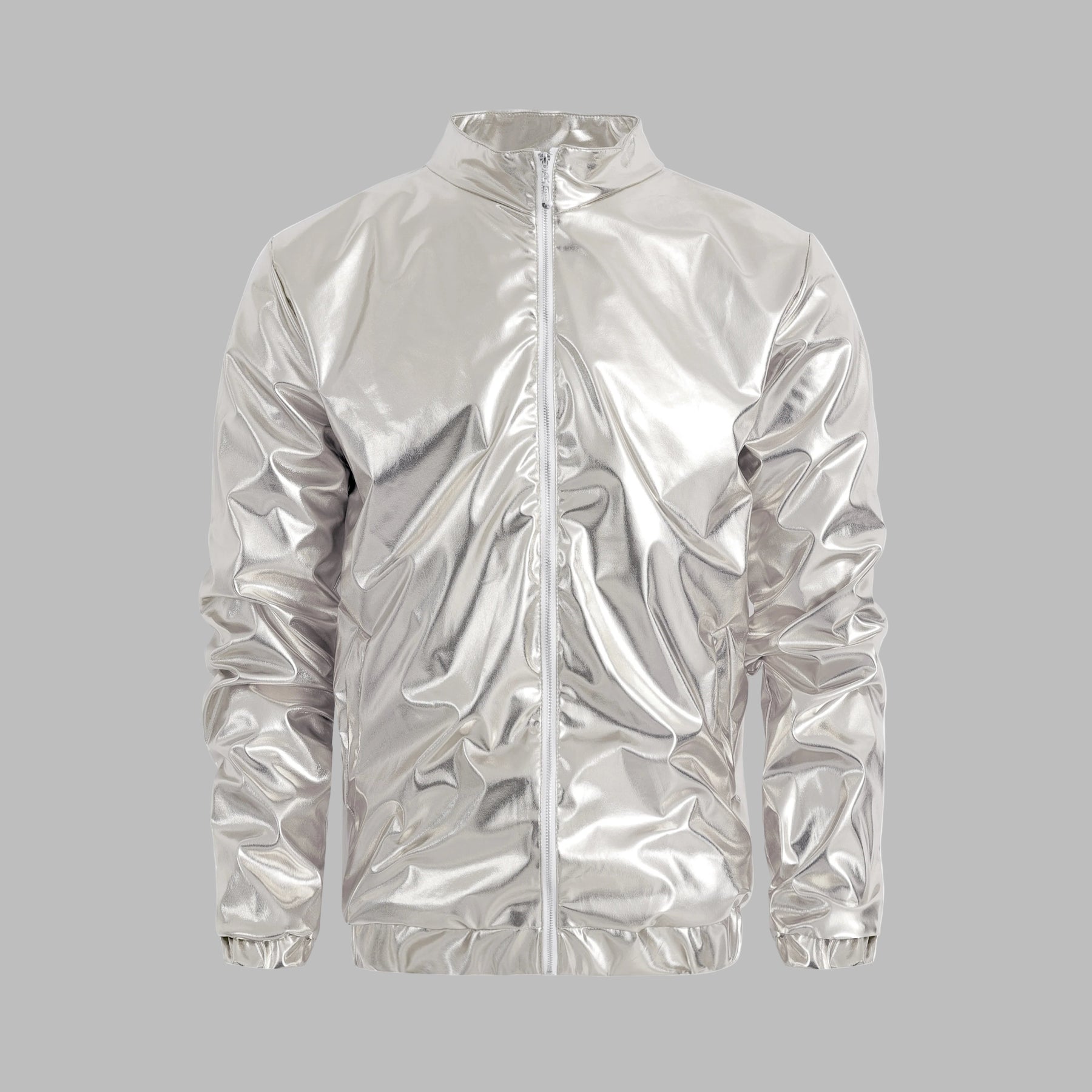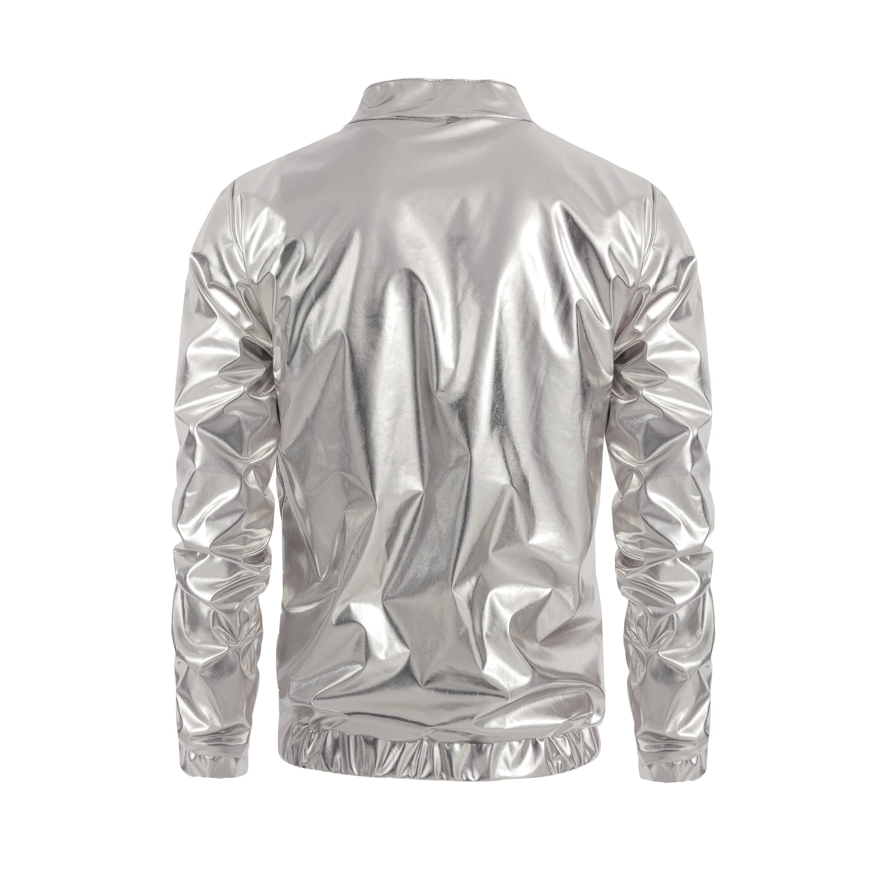 Meeste läikiv hõbedane rokk-bomber-jakk metalikviimistlusega