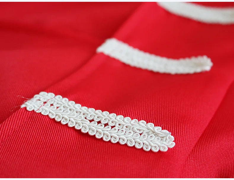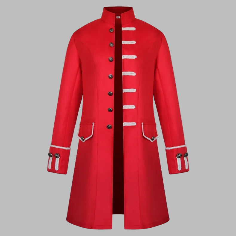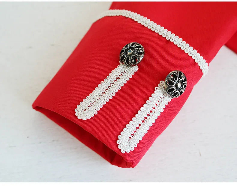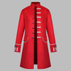 Punane steampunk-meeste mantel valgete dekoratiivsete nööridega