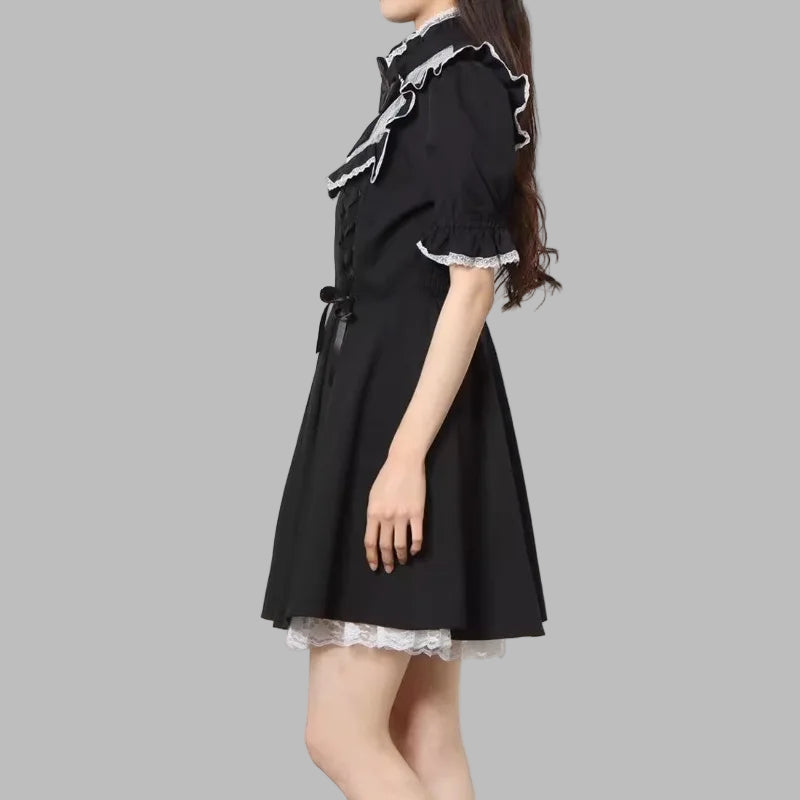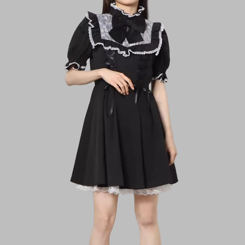 Must Jirai Kei pitsist lipsu ja paeltega kleit