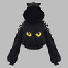 Must kapuutsiga punk-bluus kollaste silmade, sarvede ja paeltega Vaata valikuid
