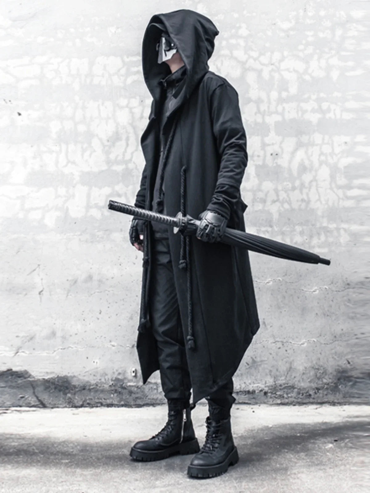 Must pikk kapuutsiga meeste mantel - techwear-stiil