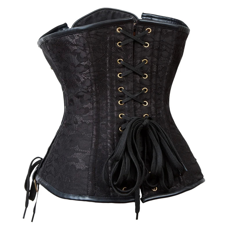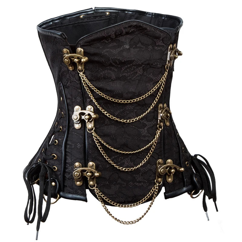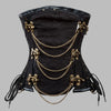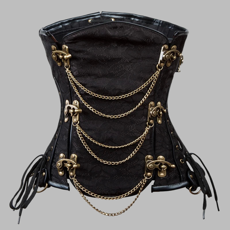 Must punk-gooti korset kuldkettide ja pannaldega, steampunk stiilis
