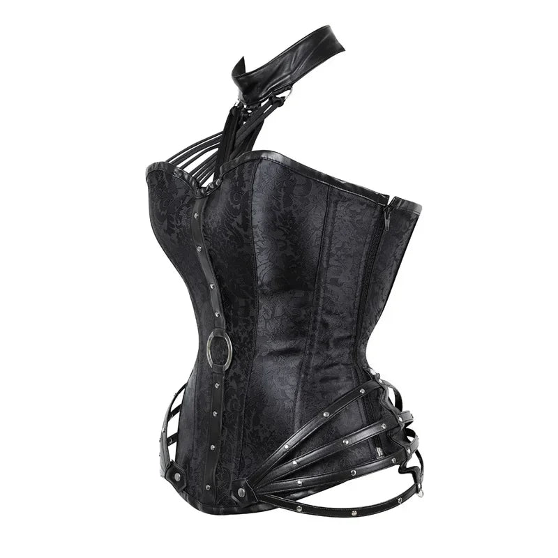 Must punk-gotika korsett rihmade ja neetidega, metal-rock stiil