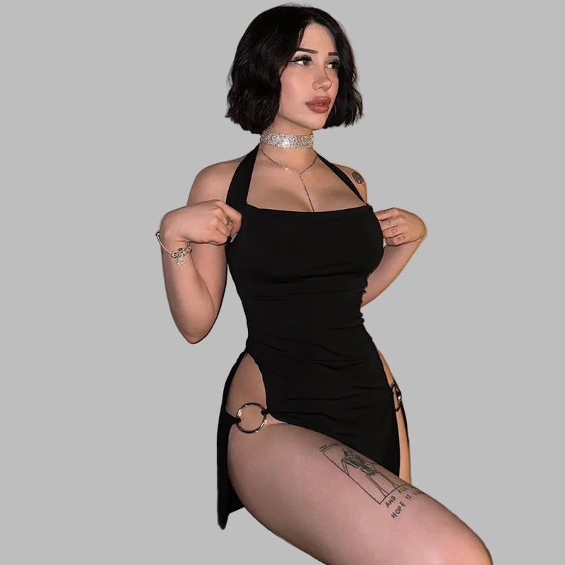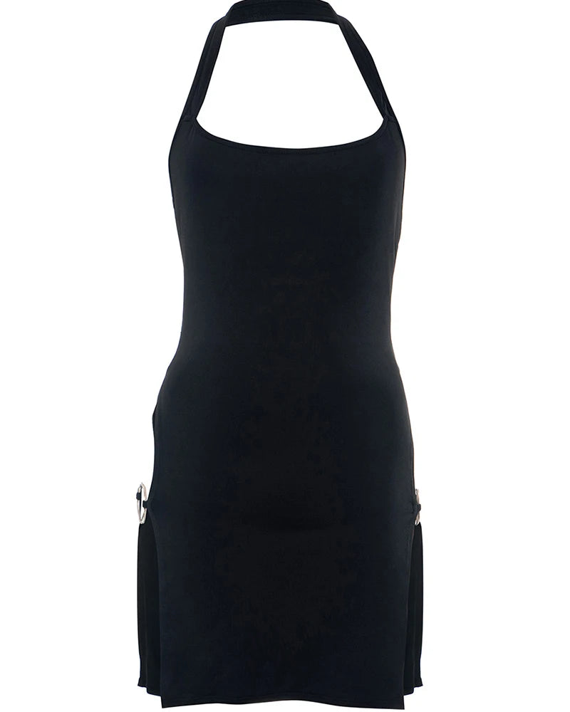 Must punk-rock stiilis minikleit halter-kaeluse ja pannaldega