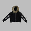 Must punkjope karvase kapuutsi ja metallmustritega