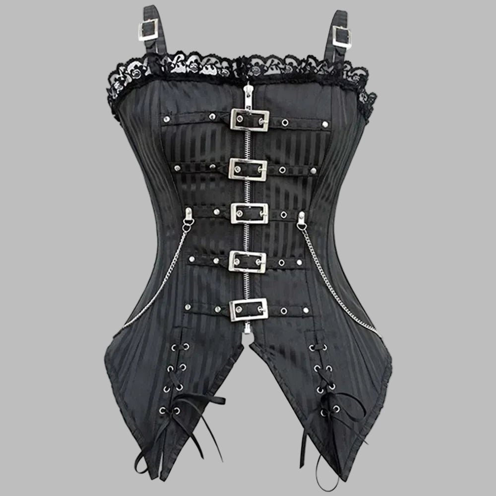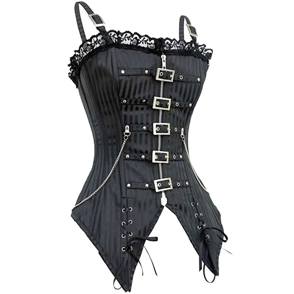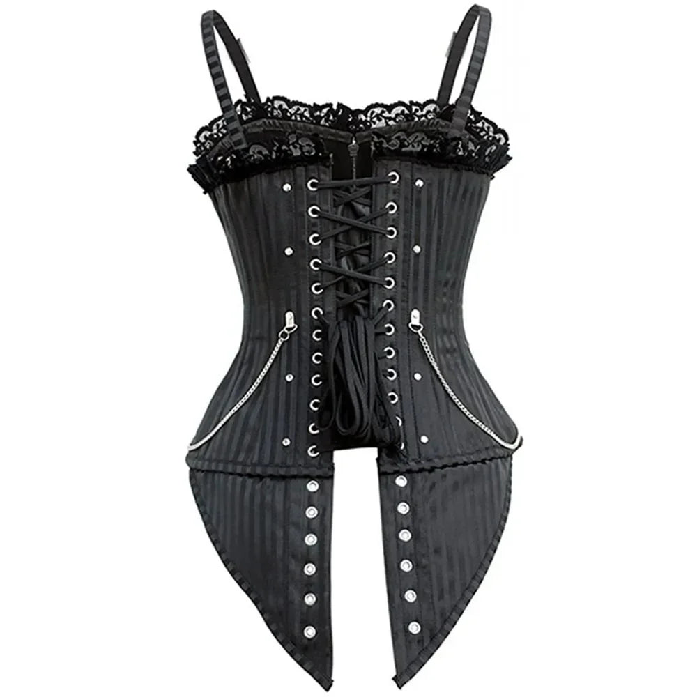 Must triibuline punk-gooti korsett neetide, pannalde ja kettidega