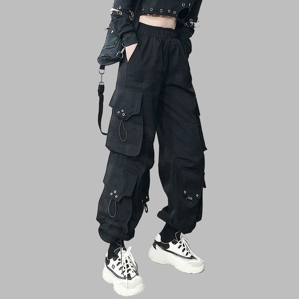 Mustad grunge-stiilis punk-taktikalised püksid taskute ja kettidega