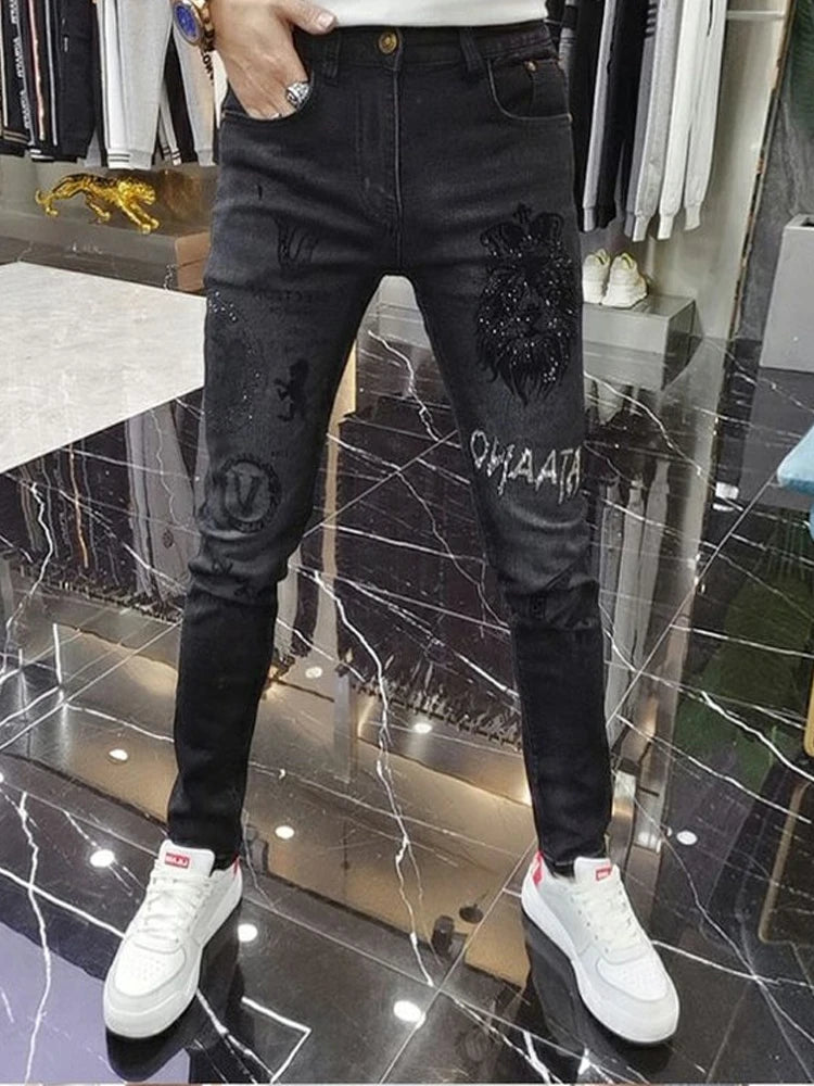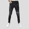 Mustad vintage stiilis kitsad teksad aukude ja metallkirjadega