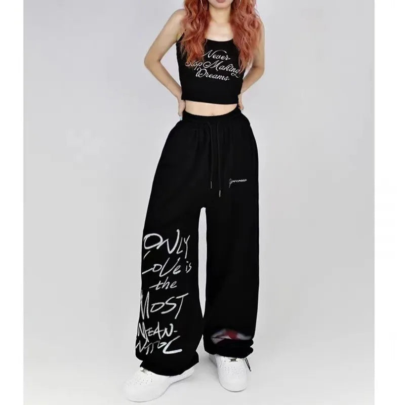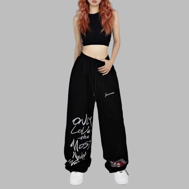 Mustad grunge’i stiilis oversize gooti rokipüksid trükikirjadega, dressiriidest