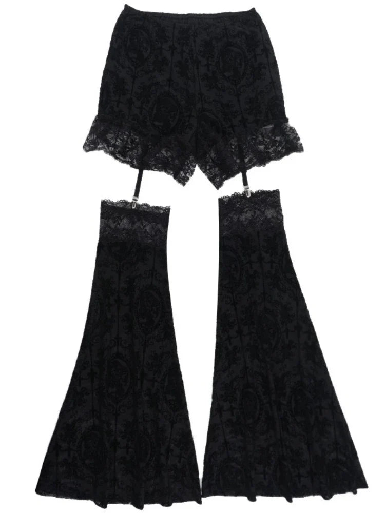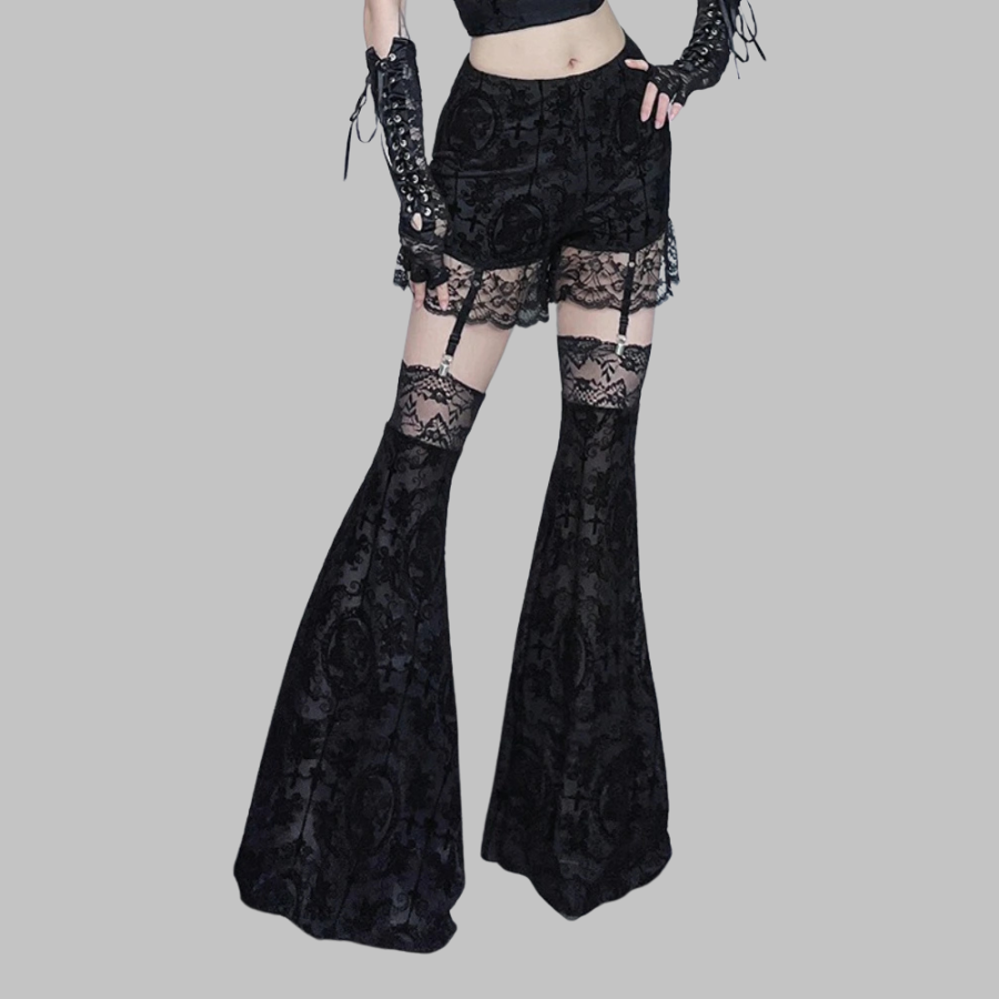 Mustad pitsilised goti stiilis laienevad püksid lühikese seelikuga