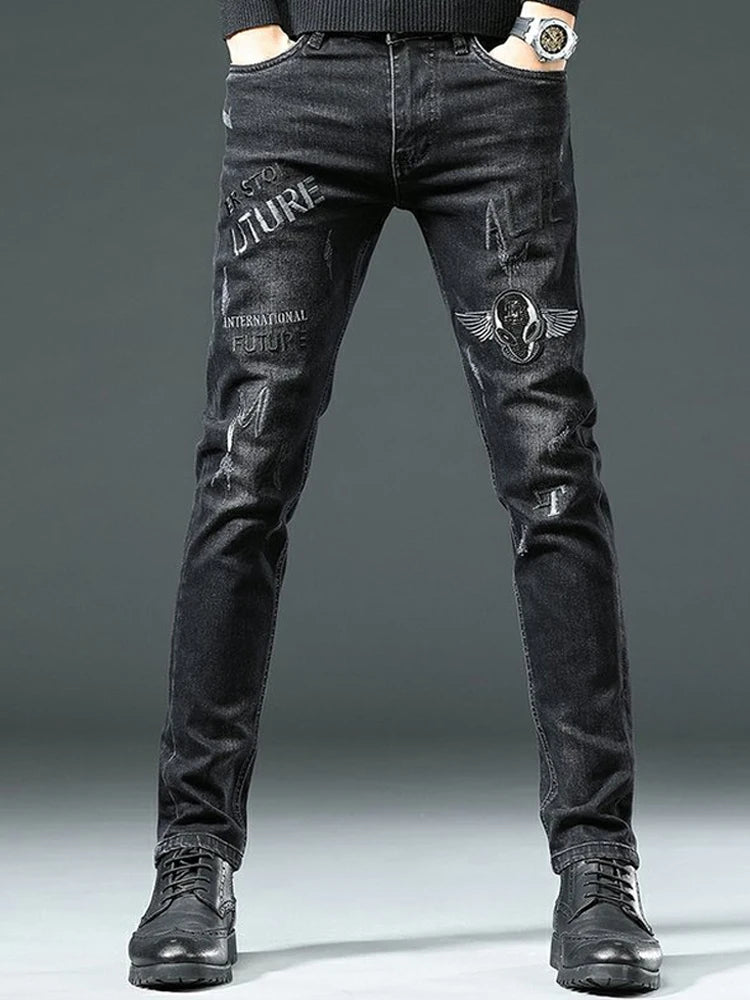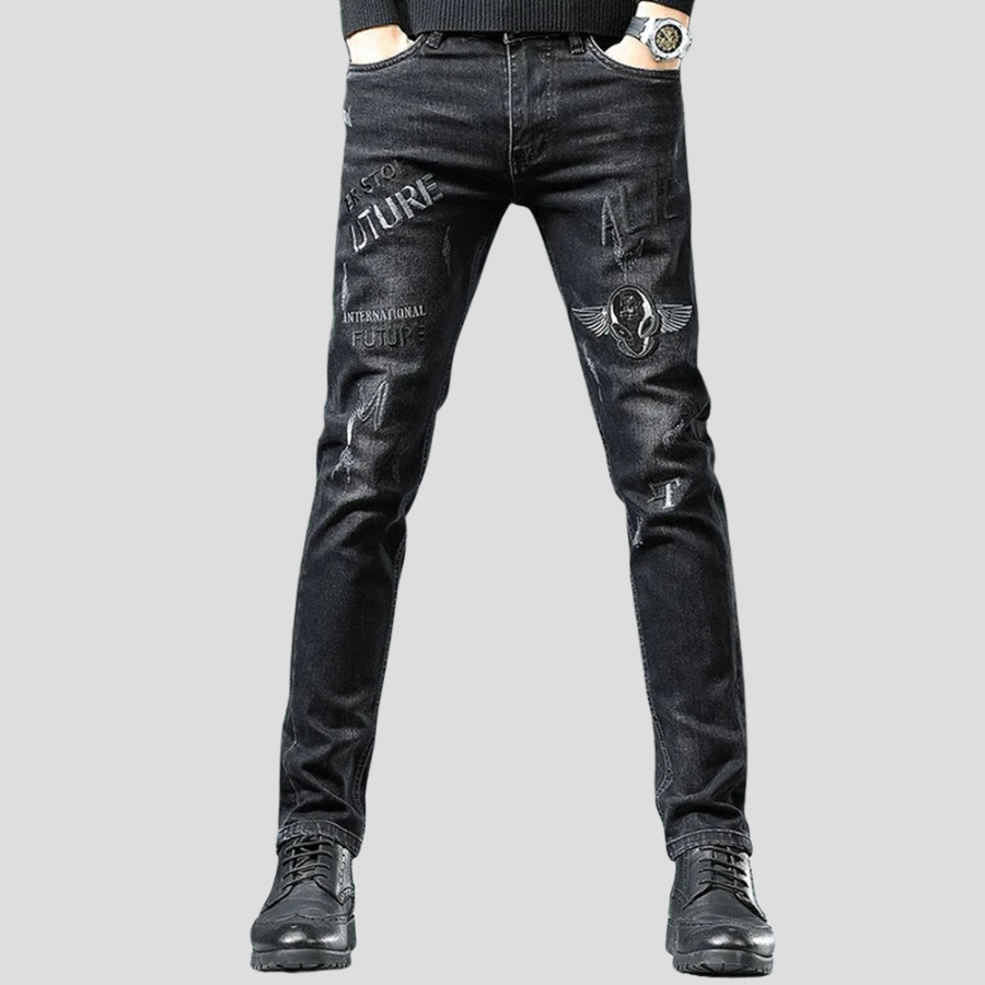 Mustad punk-teksapüksid kirjaga ja tiibadega 36