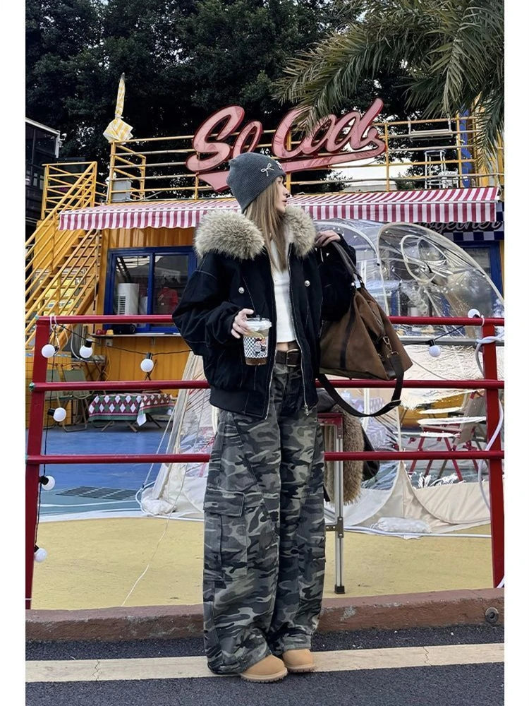 Naiste oversize militaarstiilis cargo-püksid kamuflaažmustriga ja taskutega