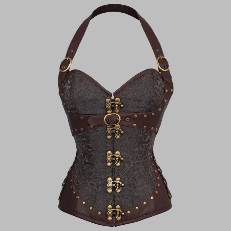 Naiste pruun steampunk-korsett sädeleva mustriga ja metallpannaldega