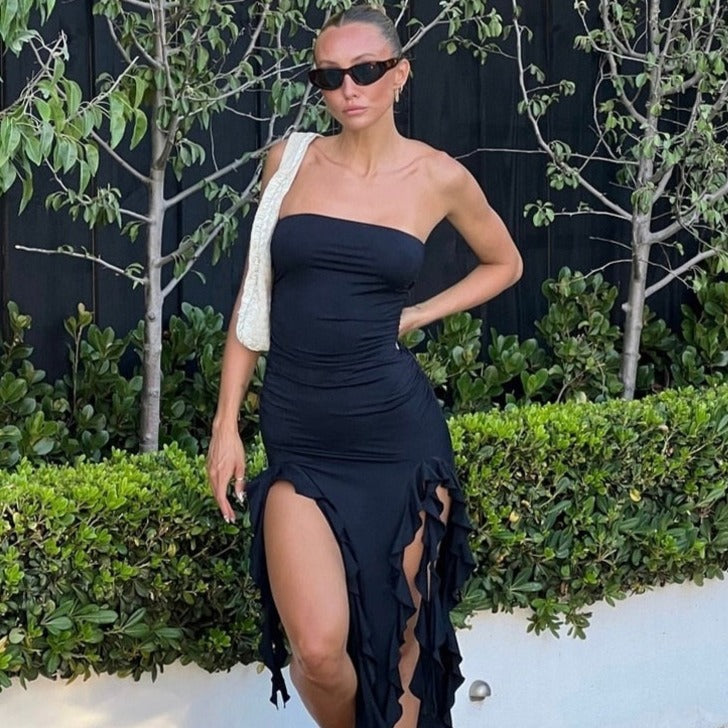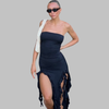 • Meelad detailid: Rinnajoont rõhutav lõige, õlapaelteta dekoltee ja volangid lisavad sellele kleidile sensuaalsust ja originaalsust, luues harmoonilise tasakaalu võlu ja elegantsi vahel.