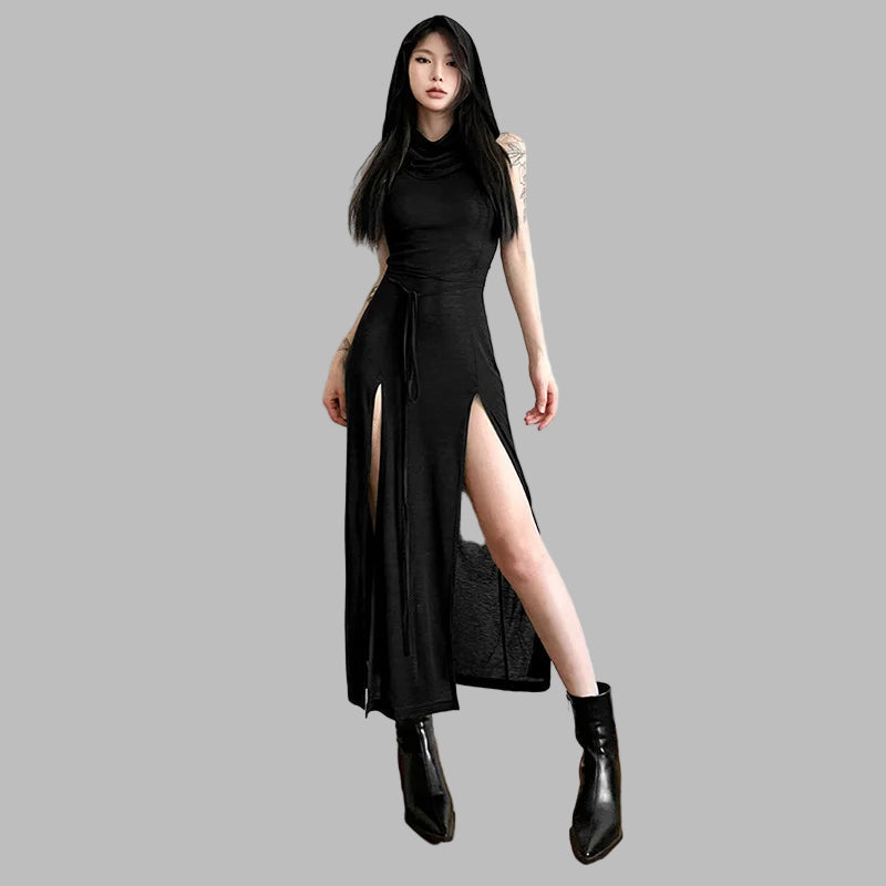 Pikk must kõrge kaelusega rock-kleit lõhikutega, suurus L