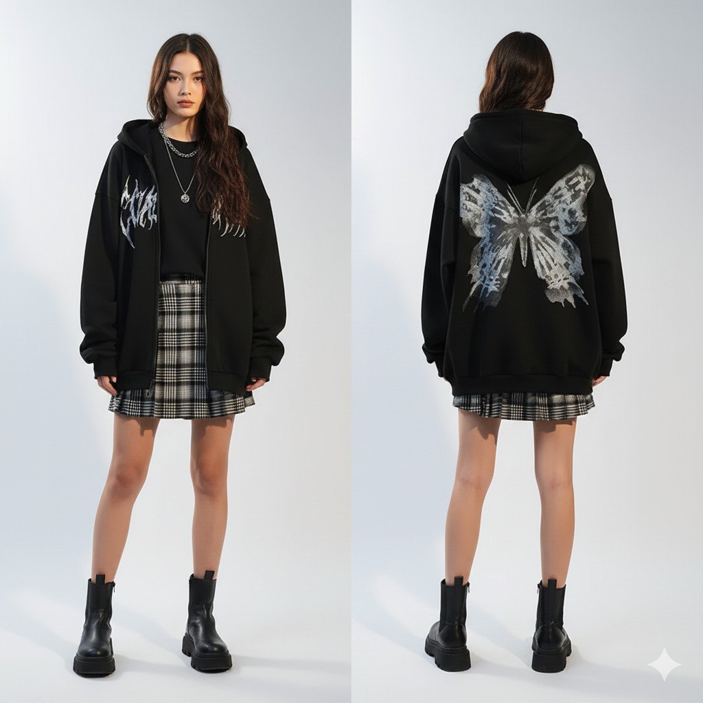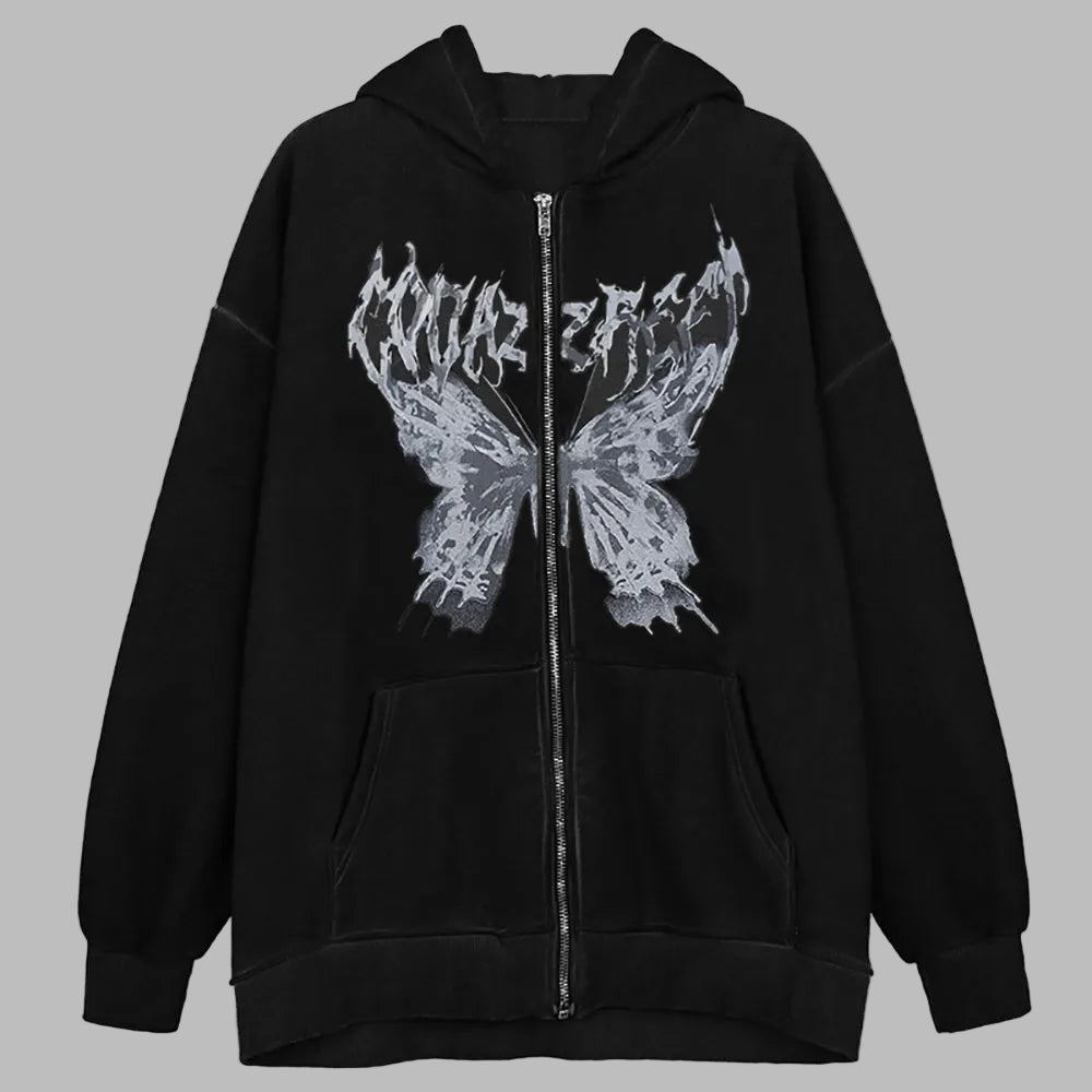 Pikk must punk rock kapuutsiga pusa liblikaga seljal