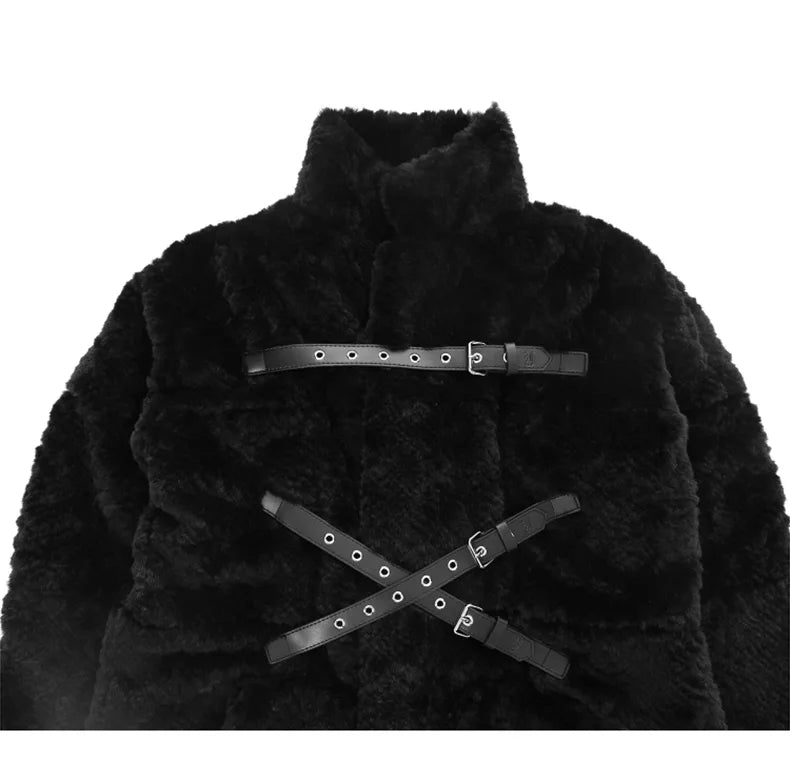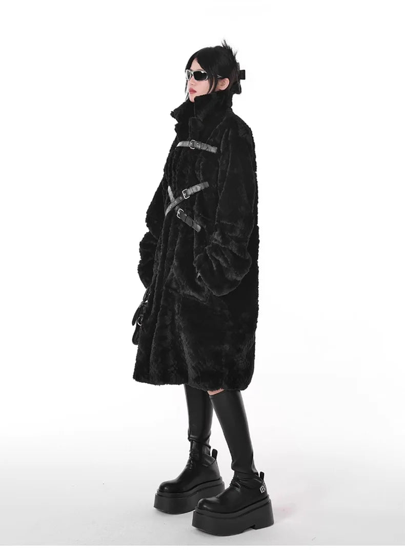 Pikk must punkmantel karvaste detailidega ja rihmadega