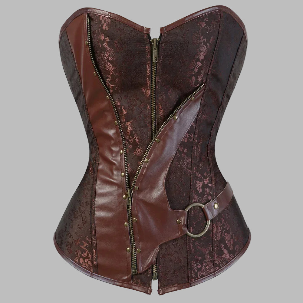 Pruun brokaadist steampunk-korsett lukuga ja rõngasrihmaga