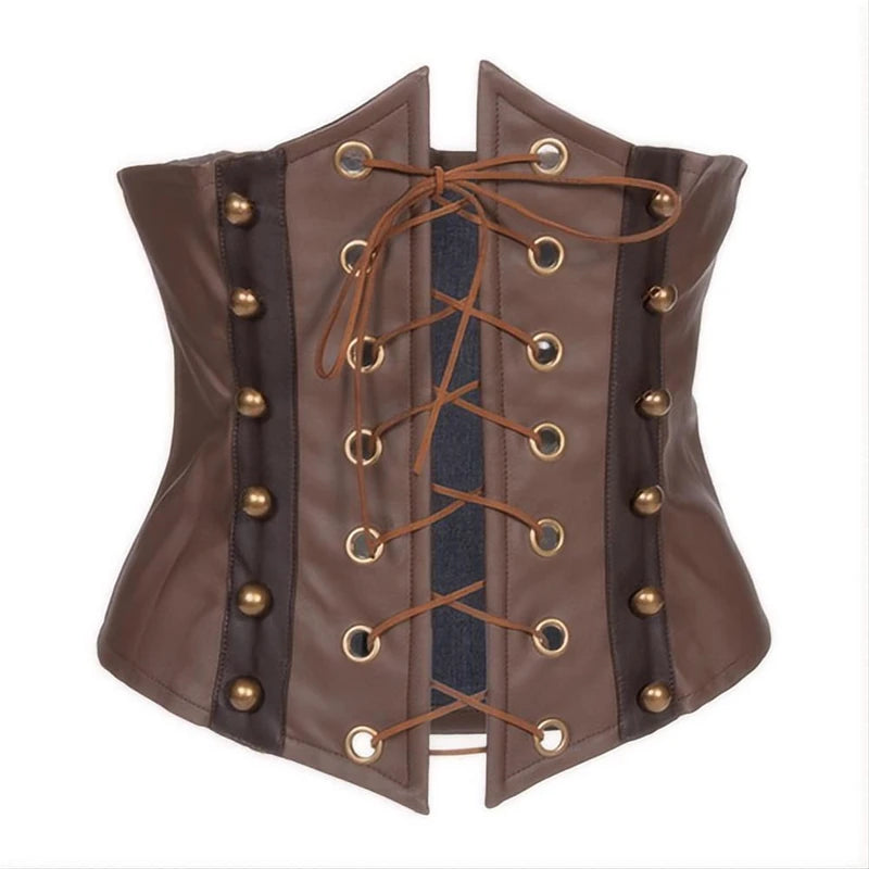 Pruun steampunk-nahkkorsett nöörpaela ja nööpidega