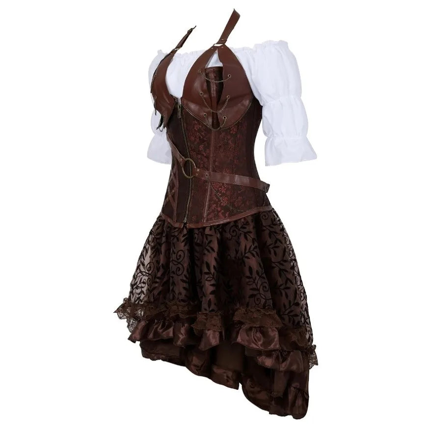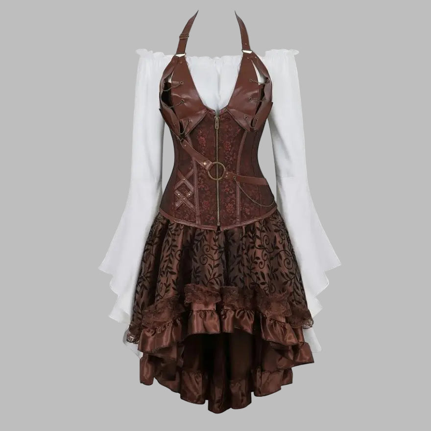 Pruun steampunk-kleit korseti ja valgete varrukatega