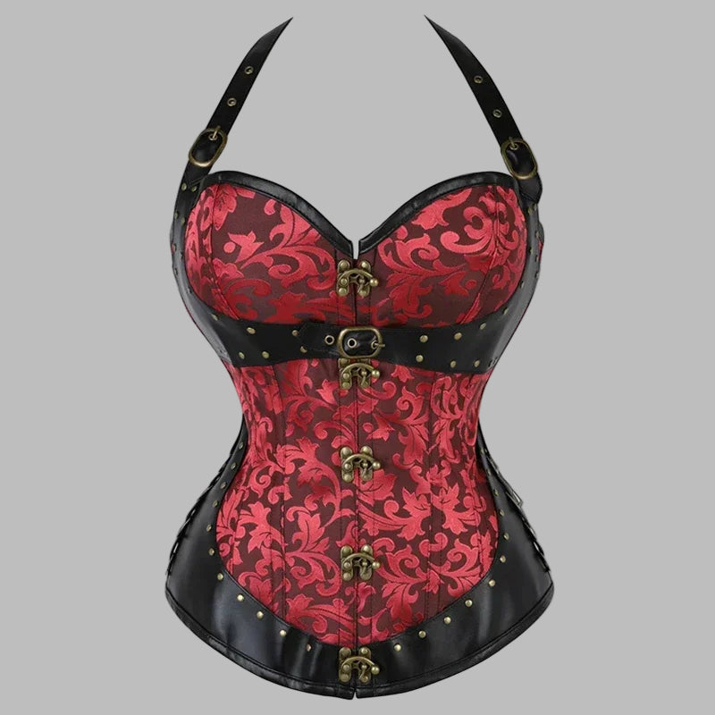 Punane brokaatne steampunk-korsett mustade nahkdetailide ja pannaldega