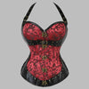 Punane brokaatne steampunk-korsett mustade nahkdetailide ja pannaldega Vaata valikuid