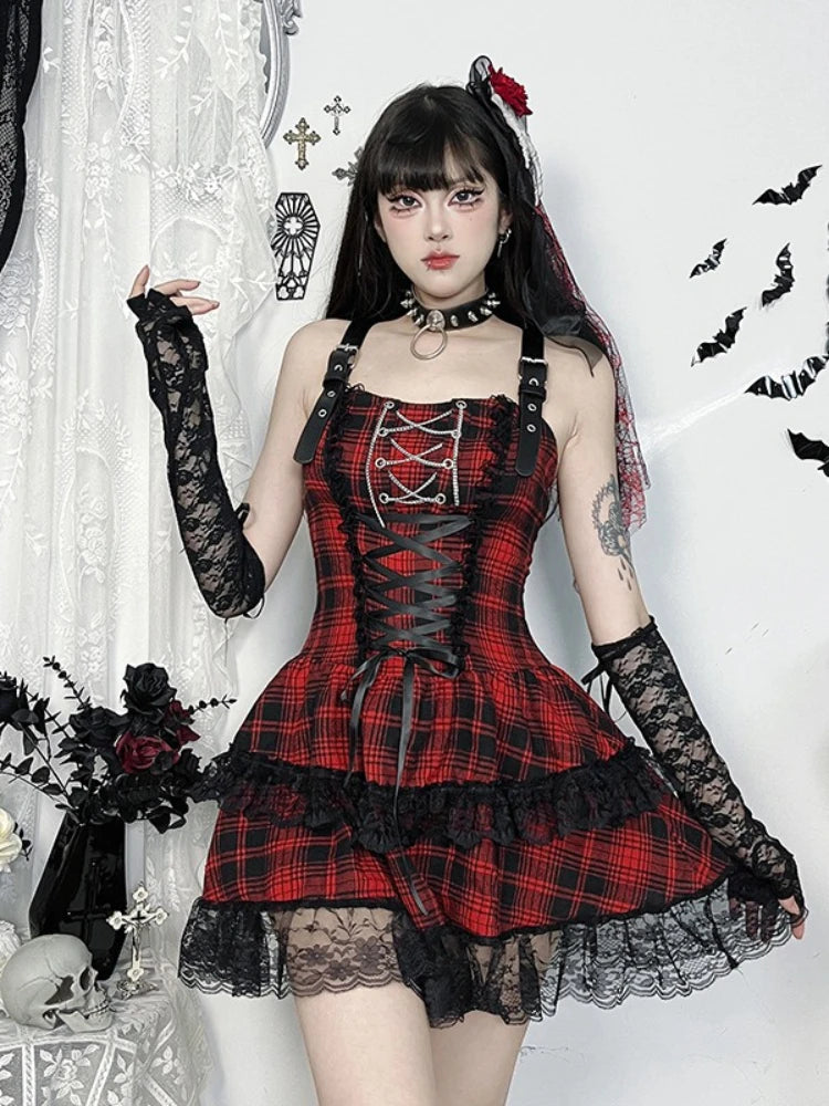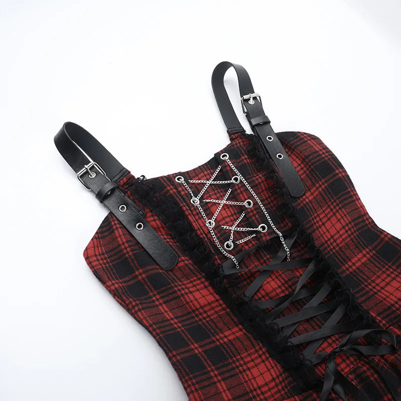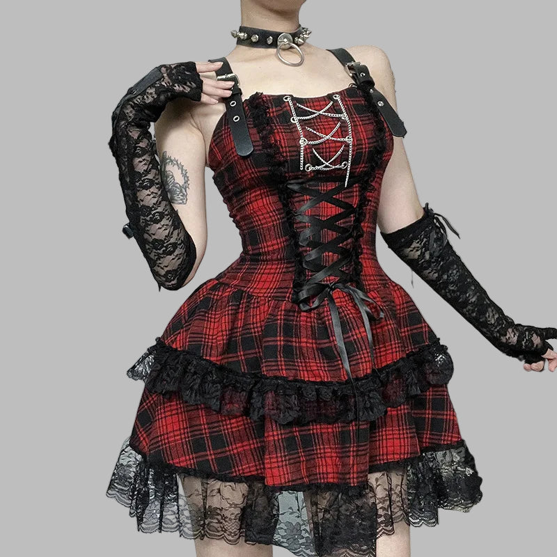 Punane rock-punk stiilis kleit kettide ja pitsiga