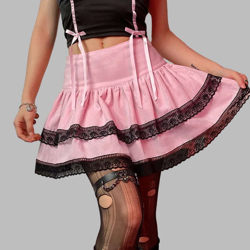 Roosa Jirai Kei punk-seelik musta pitsi ja volangidega
