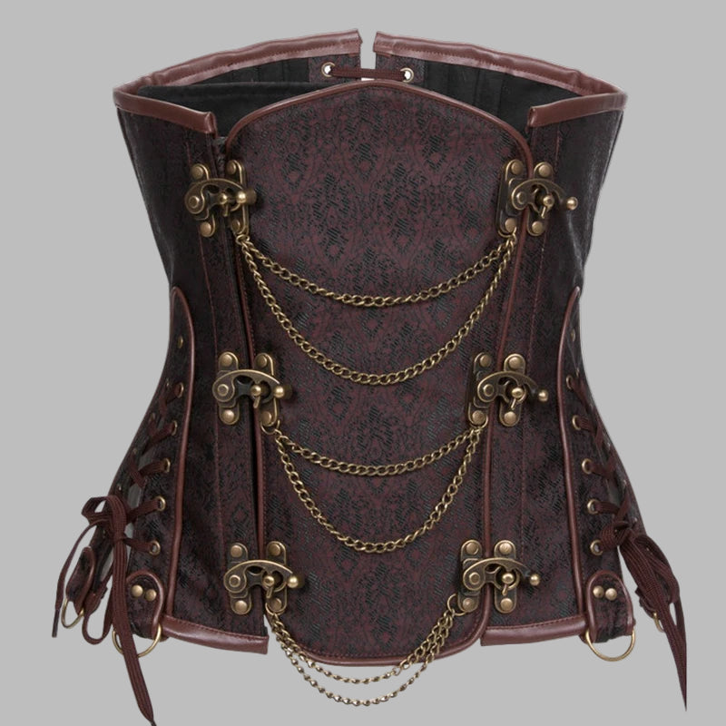 Steampunk-gooti pruun korset kettide ja messingist pannaldega