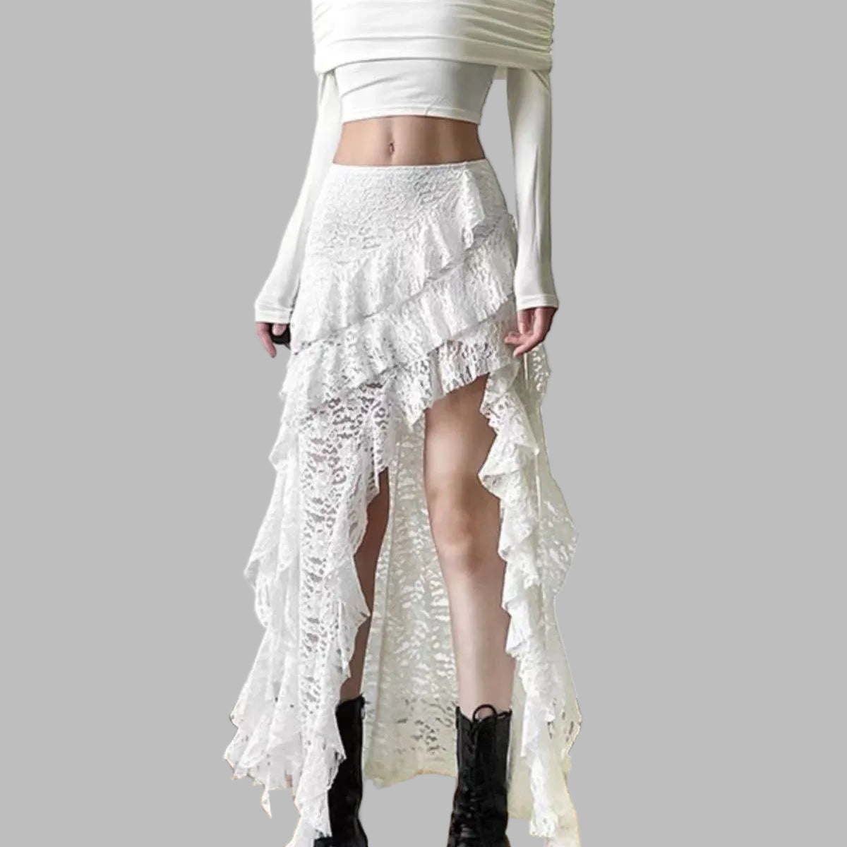 Valge asümmeetriline pits- ja narmastega rock-seelik, L