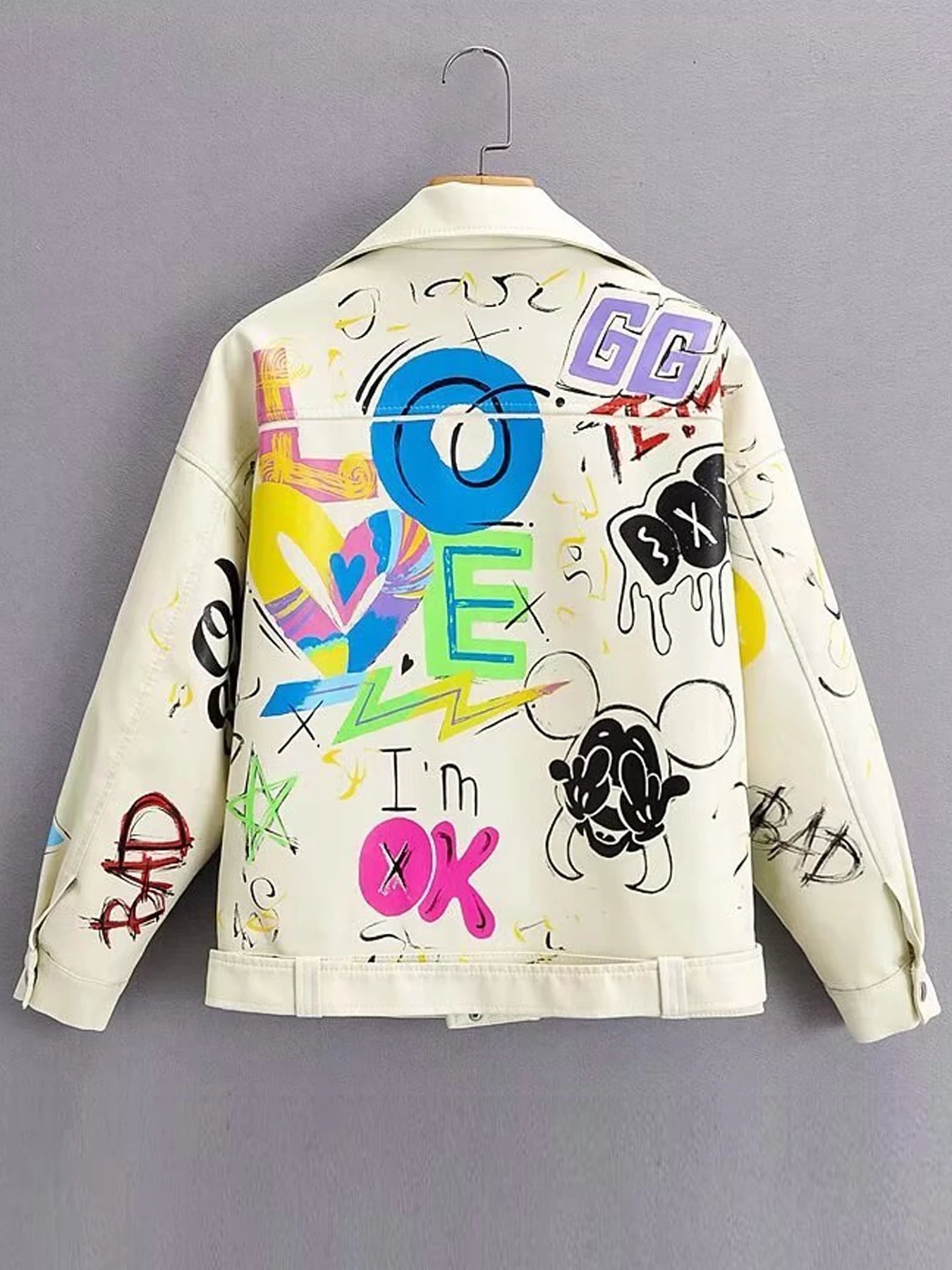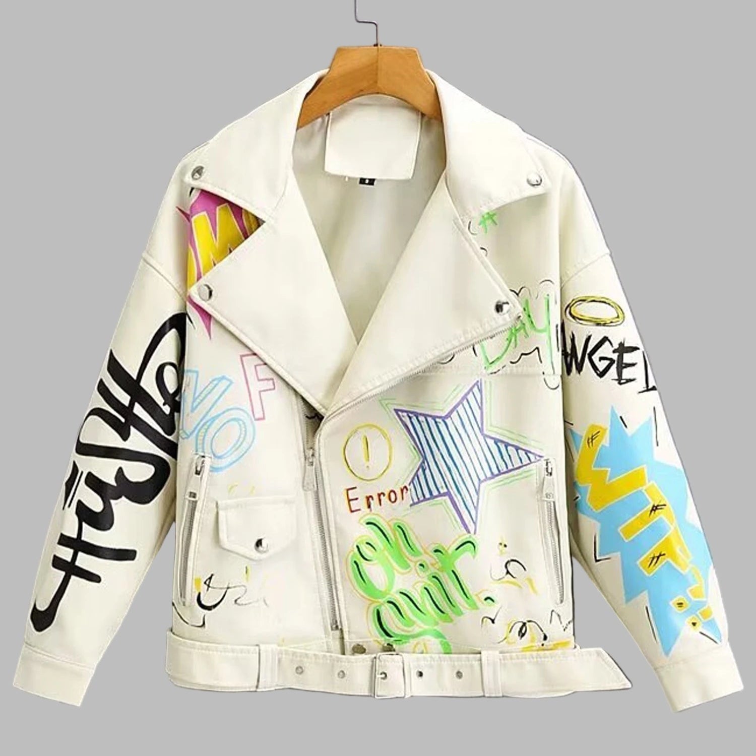 Valge nahkne graffiti punk‑stiilis ramones’i jope