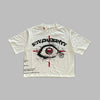 Valge punkstiilis T-särk silma ja sihtmärgi motiiviga