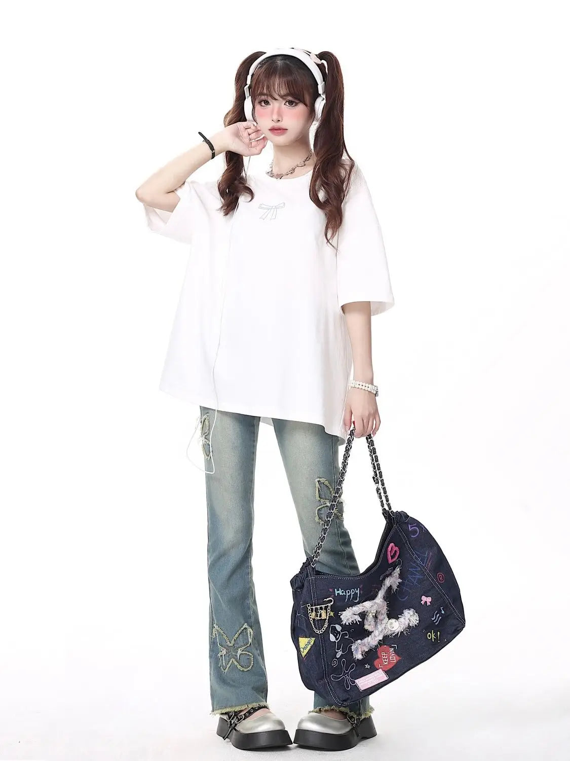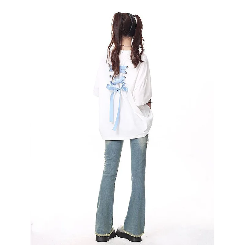 Valge rock-stiilis pusa selja nöörimise ja sinise lipsuga